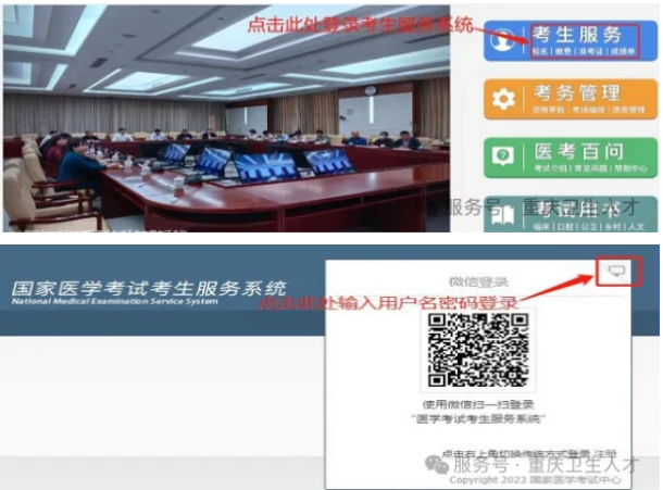 (一)登录国家医学考试网(http://www.nmec.org.cn/),进入“考生服务”,输入用户名和密码或微信扫码进入个人系统。
