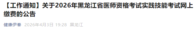 黑龙江伊春2026年医师资格考试实践技能缴费4月12日截止!以下为黑龙江伊春考点官方提醒,请相关考生仔细查看,按时完成技能缴费!