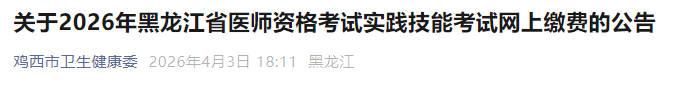 黑龙江鸡西2026年医师资格考生速去实践技能缴费!即将截止!以下为黑龙江鸡西考点官方提醒,请相关考生仔细查看,按时完成技能缴费!