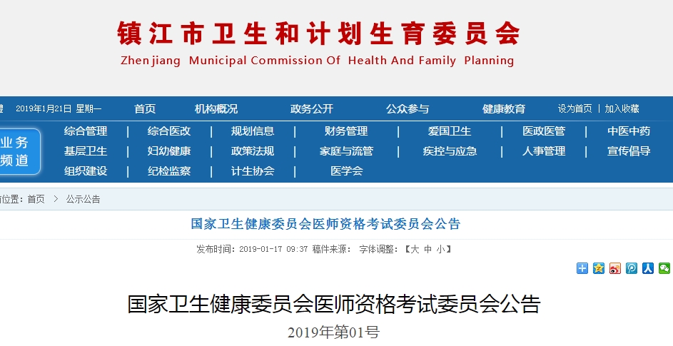 “2019年国家卫生健康委员会医师资格考试江苏省镇江市公告”由医学教育网编辑整理搜集,更多考试信息敬请关注医学教育网。