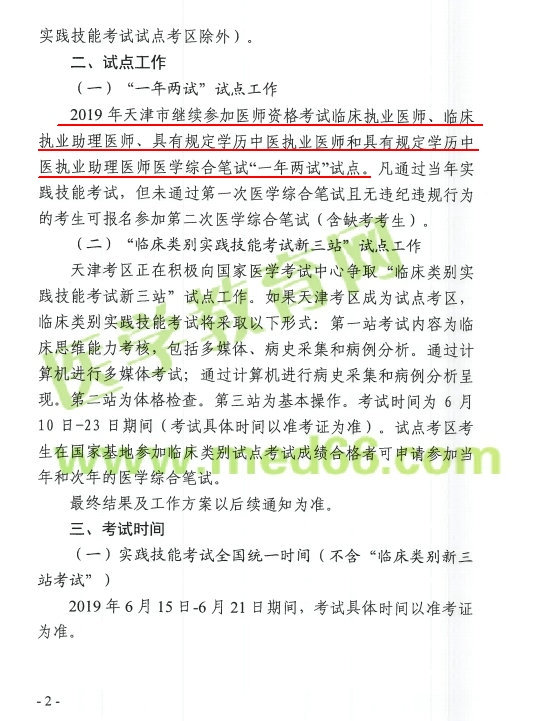 “2019年天津市继续开展医师资格“一年两试”试点工作”由医学教育网编辑整理搜集,更多考试信息敬请关注医学教育网。