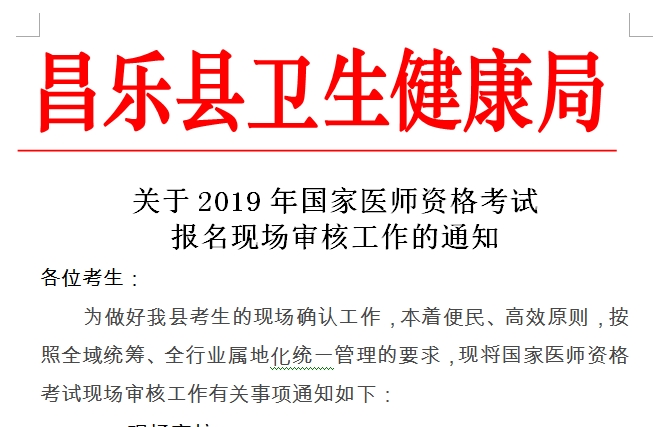 “山东潍坊昌乐县关于2019年国家医师资格考试报名现场审核工作的通知”的内容,由医学教育网编辑整理搜集,希望可以帮助到大家!