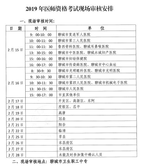 2019年山东聊城市医师资格考试现场审核时间/审核地点安排通知,具体内容如下: