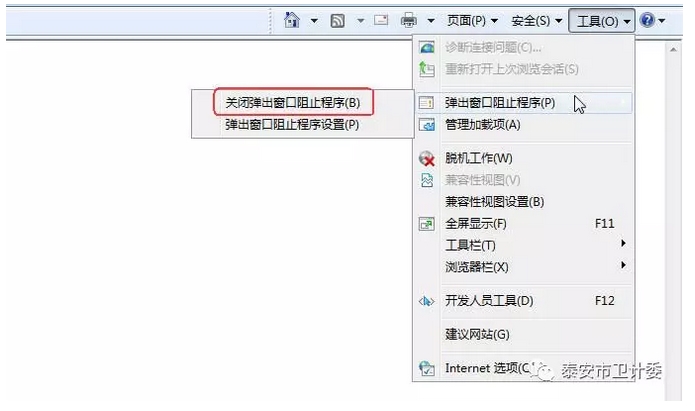 在菜单中选择“工具->弹出窗口阻止程序”,如果二级菜单显示“关闭弹出窗口阻止程序”,则点击此菜单。如下图: