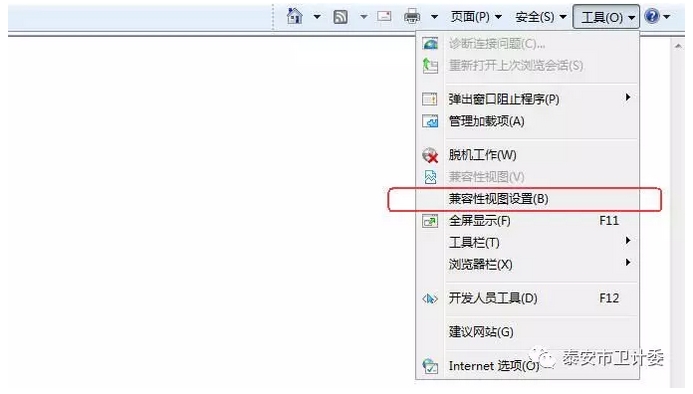 在菜单中选择“工具->兼容性视图设置”,如下图: