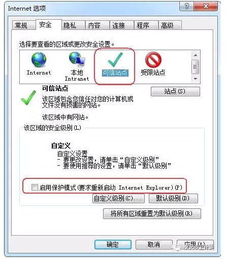 3. 选择“安全”TAB页,点击“可信站点”,去掉“启用保护模式”选项的对号,点“应用”按钮,如下图: