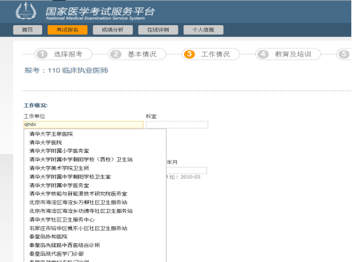 答:在系统中以上两者的填写方式相同。如填写工作单位,在网上报名系统中“工作单位”可以通过输入拼音首字母或直接填写工作单位名称的方式检索,在查询到的下拉框中选择您的工作单位即可。当鼠标从工作单位项移开后,如果工作单位文本框显示黄色表示您输入的工作单位没有收录在网站工作单位字典中(若出现此种情况,请您仔细核对输入的工作单位是否有误,若确认无误,则需申请添加数据,请按系统提示登陆相关链接进行相应的操作。考生可待后台数据库添加成功后在菜单中选择。);显示红色表示您未输入工作单位;显示灰色表示您选择的工作单位存在系统中并可以使用。如下图:
