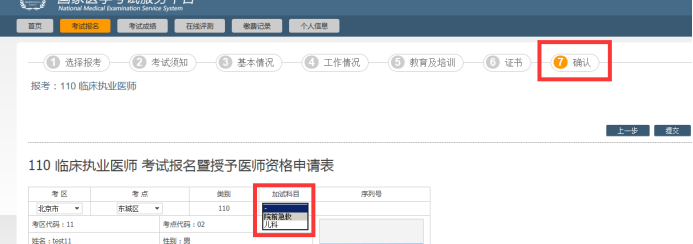 答:报考临床执业医师且在院前急救或儿科岗位的考生可以申请参加短线医学专业加试,网上填报时,在报名的第七步确认时,在表中选院前急救或儿科加试。参加短线医学专业加试的考生,如通过加试获得医师资格,限定在加试的专业或岗位范围内执业,如需变更执业范围需重新参加医师资格考试获取医师资格。如下图: