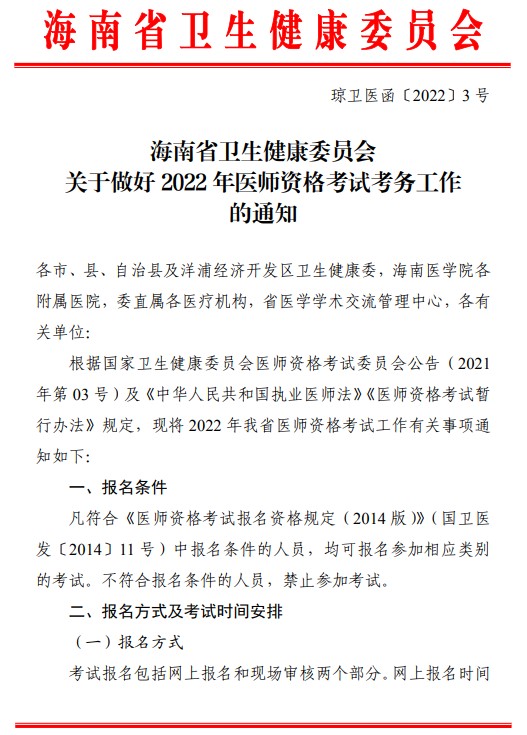 以上就是医学教育网关于“海南省卫生健康委员会关于做好2022年医师资格考试考务工作的通知”的相关介绍,希望能够帮助到大家,更多资讯尽在医学教育网医师资格考试报名时间栏目!