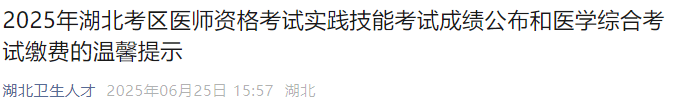 现将2025年度湖北考区医师资格实践技能考试成绩查询和医学综合考试缴费事宜,提示如下:
