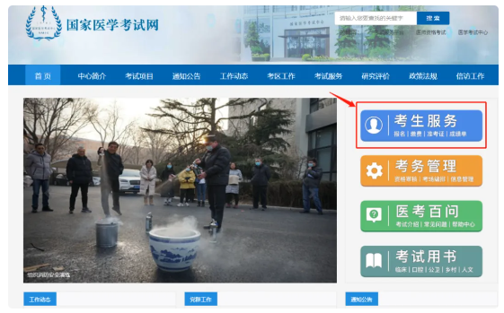第一步:登录国家医学考试网——选择“考生服务”,进入“国家医学考试考生服务系统”操作。
