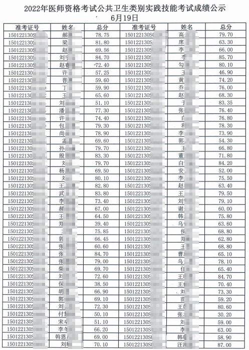 【6月18日成绩】内蒙古考区2022年医师资格考试公共卫生类别实践技能考试成绩公示(6月18日)