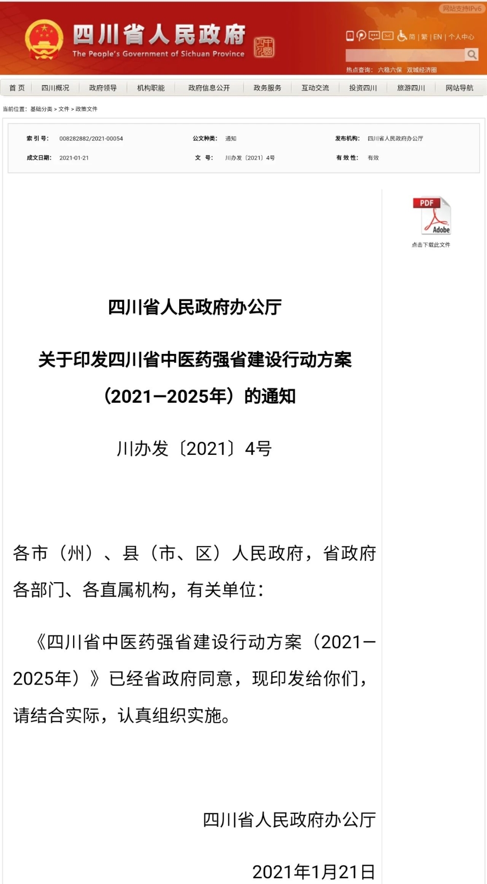 1月21日,省政府办公厅出台《四川省中医药强省建设行动方案(2021—2025年)》,全面推进新时代中医药强省建设。