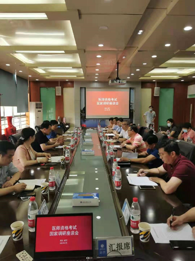 调研组一行首先参观了咸宁考点湖北科技学院的计算机考场。随后召开了座谈会,座谈会由湖北医学考试中心丁果主任主持,座谈会先听取了湖北科技学院白育廷副校长的介绍,湖北科技学院作为湖北最早的4所医学类院校之一,全力支持医师资格考试工作,不但是临床类国家实践技能考试基地,也是医学综合考试计算机化考试考场,在人力、物力和财力上为考试工作提供全面保障。之后湖北考区报告了全省17个考点近几年的医师资格考试总体情况,并针对前期摸排的各考场机房情况、机位数、终端使用年限、承担机考次数、信息技术人员培训情况、与今年考试预估人数匹配情况以及机考取得的好经验和需改进的建议等进行了详细分析和说明。武汉、咸宁、黄石考点的考务负责人和技术首席也从机考组织实施、机考系统、培训等方面进行了补充和讨论。