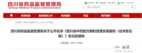 为落实国家药监局等四委局《关于结束中药配方颗粒试点工作的公告》要求,结合四川实际,我局起草了《四川省中药配方颗粒管理实施细则(征求意见稿)》(见附件),现公开征求修改意见。如有意见建议,请于9月1日前书面反馈我局药品注册管理处。