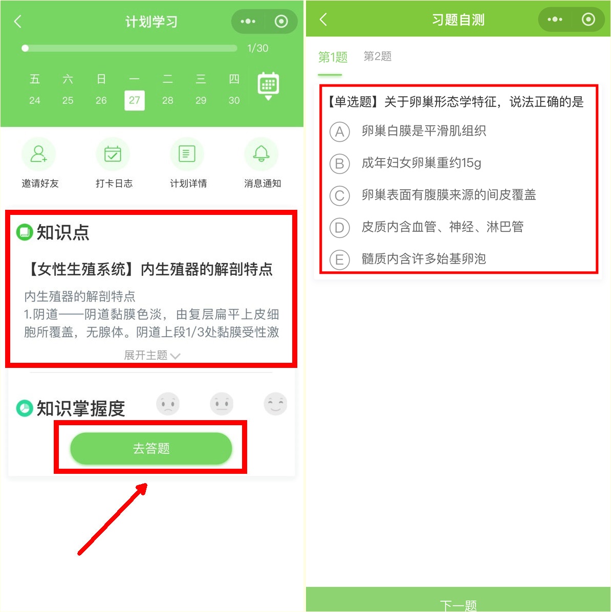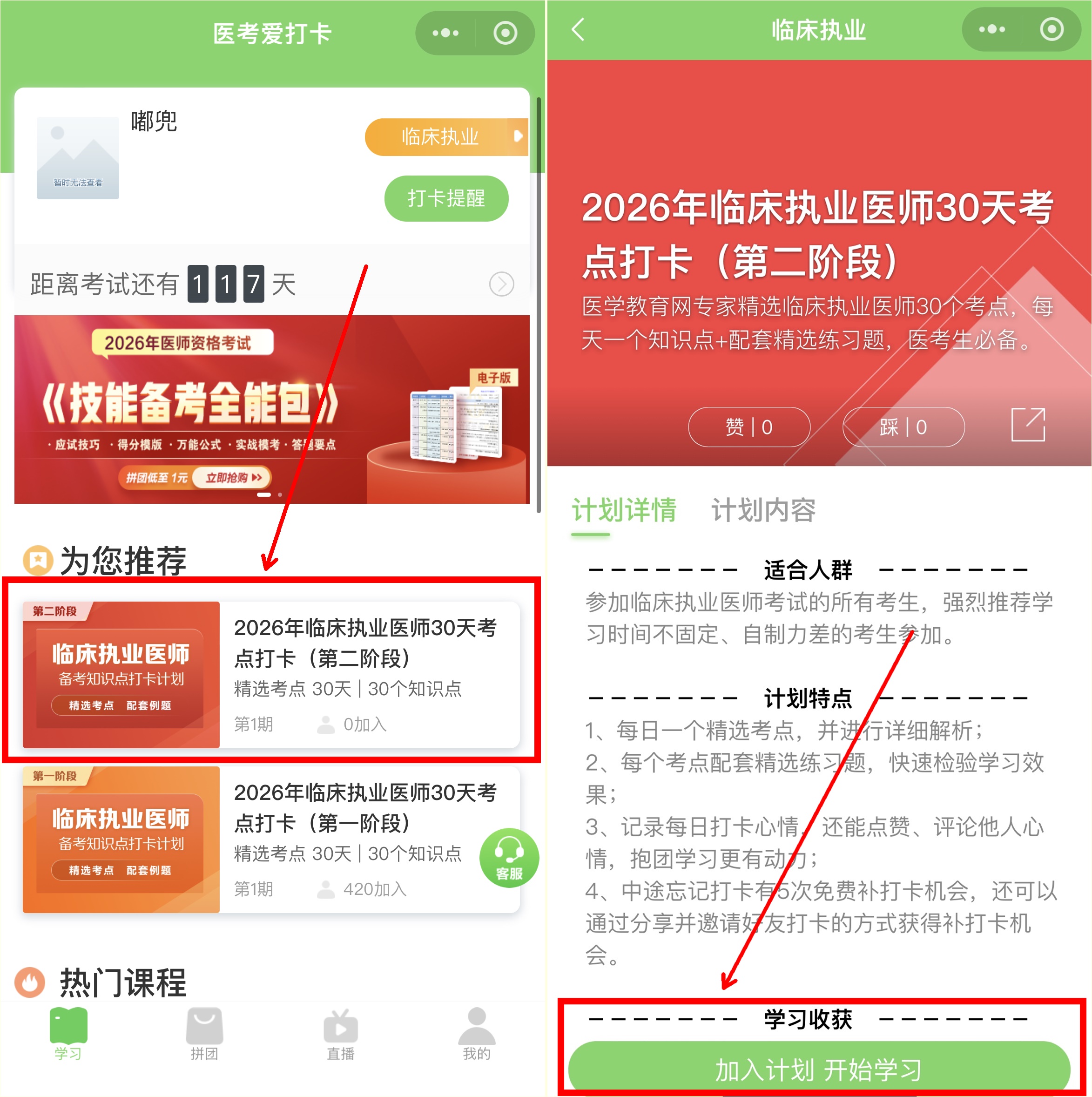 请选择“您的备考计划”,如临床执业医师备考复习计划(第二阶段),然后点击下方“加入计划开始学习”按钮,开始正式进入打卡学习;