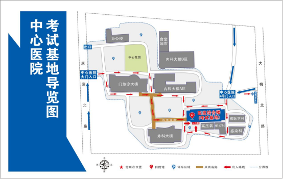 六、为避免考场区域拥堵,请各位考生不要开车前往,确需开车前往的,可将车停在大桃北路雄森国际停车场(收费停车场,车位有限),停车后再从医院4号门方向沿指路路线(见附件2入考场路线平面图)步行导航进入住院医技综合大楼考试基地;