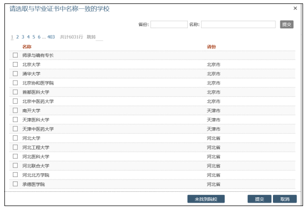 问:在填写“教育及培训”信息时,发现系统中未能找到对应的毕业院校,该如何操作?