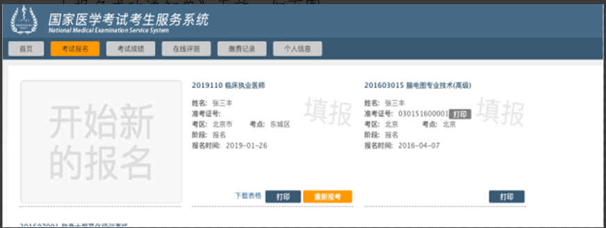 答:如需修改个人报名信息,须在网上报名截止日前,再次登陆服务平台,进入“考试报名”栏目,在需要修改的报名下方点击“重新报考”,进行信息修改,修改完成后务必再重新提交,如未提交,视为报名不成功,报名成功后需重新打印《医师资格考试网上报名成功通知单》,原《医师资格考试网上报名成功通知单》无效。如下图: