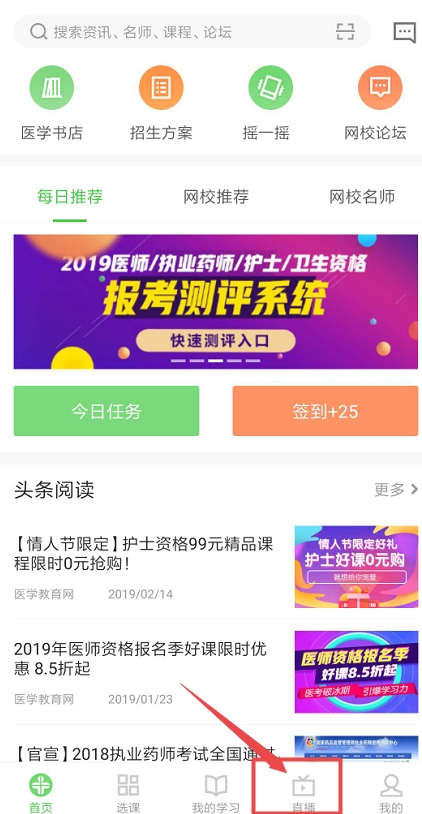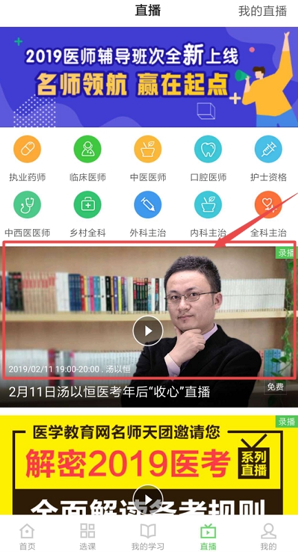下载“医学教育网App”,打开之后,如下图,点击下方“直播”: