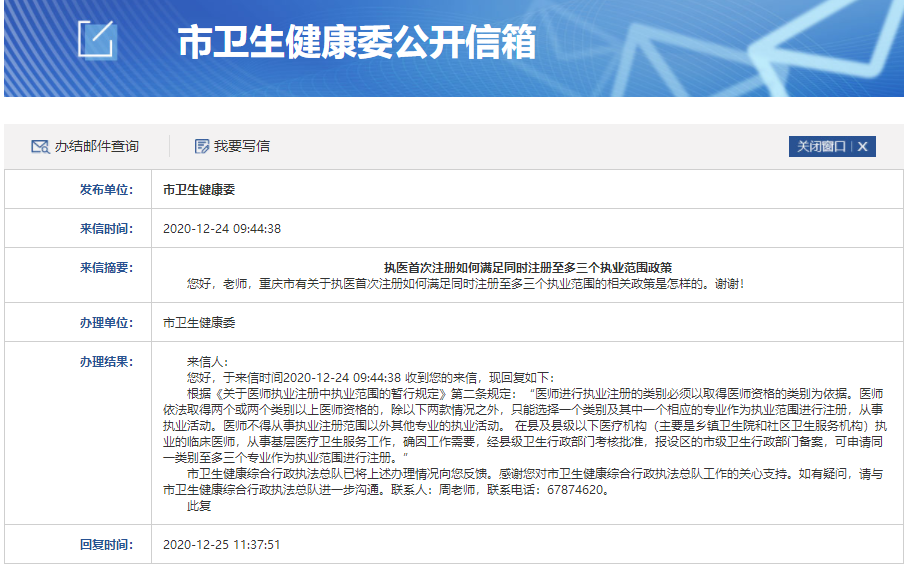 关于“重庆卫健委回复:执医首次注册如何满足同时注册至多三个执业范围政策?”相关内容,相信参加医师资格考试的考生都在关注,为方便大家了解,在此医学教育网小编为大家整理如下内容: