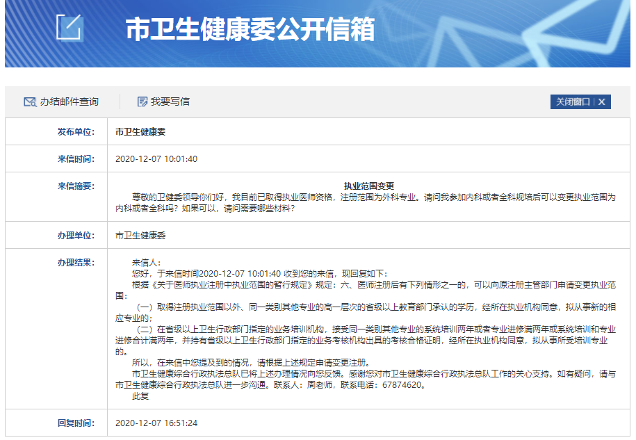 提问:尊敬的卫健委领导你们好,我目前已取得执业医师资格,注册范围为外科专业。请问我参加内科或者全科规培后可以变更执业范围为内科或者全科吗?如果可以,请问需要哪些材料?