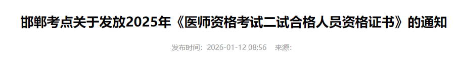 2025年邯郸考点《医师资格考试二试合格人员资格证书》即将发放,现将相关事宜通知如下: