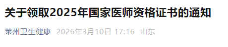 山东莱州2025年医师资格证书开始发放,3月13日截止!请相关考生及时查看官方通知要求,及时领取证书尽快完成注册。
