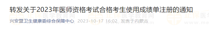 内蒙古兴安盟考点2023年医师资格考试合格考生请注意! 2023年医师资格考试合格分数线已经下发,合格考生信息已进入医师资格管理信息系统。2023年医师资格考试合格考生使用成绩单注册已经开始,以下为官方通知,请相关考生了解。