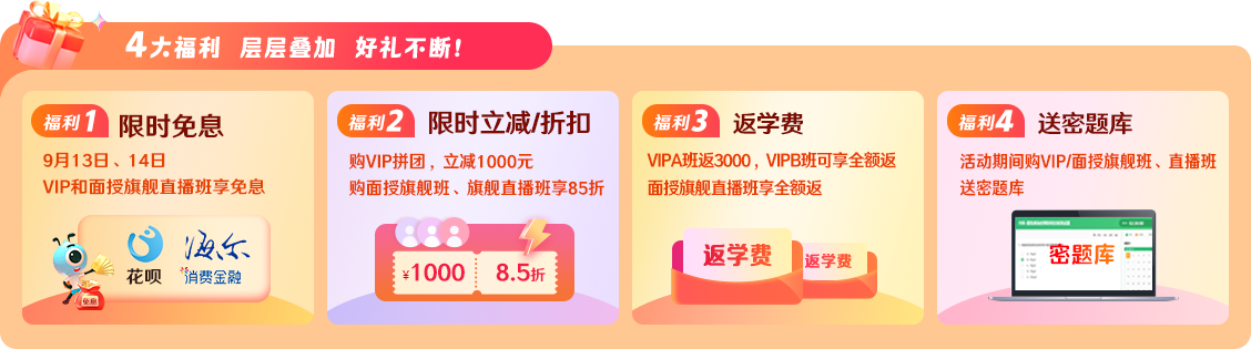 4.面授旗舰A/B班、旗舰直播班8.5折;购课送相应科目密题库;9月13日、14日旗舰直播班限时享分期0手续费。