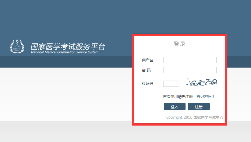 (三)在“国家医学考试服务平台”登录界面填写正确的用户名、密码及验证码;