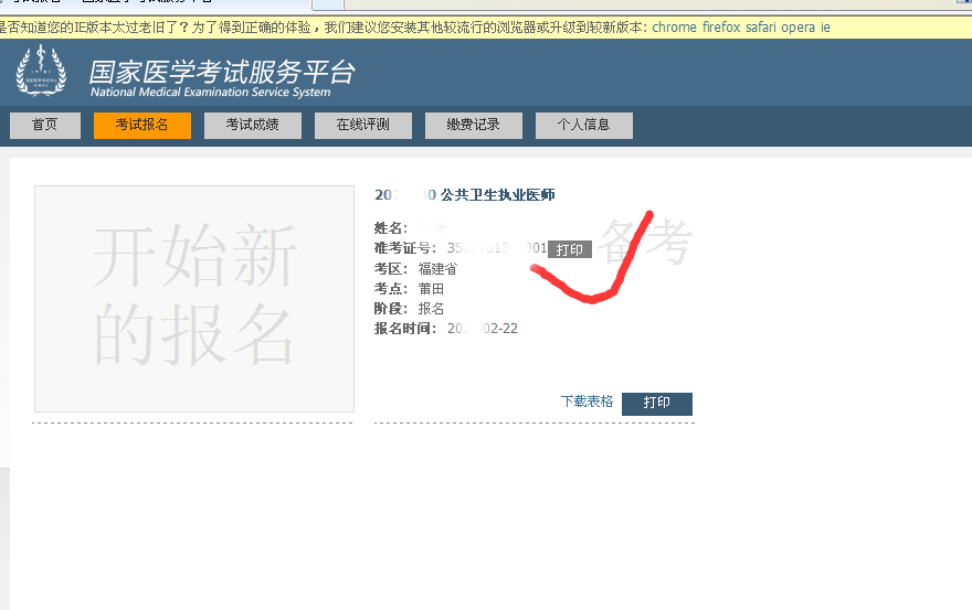 (四)成功登录后,进入“考试报名”界面,点击准考证号右侧的“打印”链接即可打印。