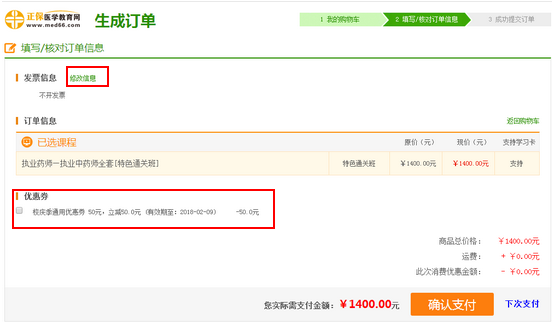 如果需要发票的话,点击“修改信息”;如果有优惠券可以使用的话,可以勾选优惠券: