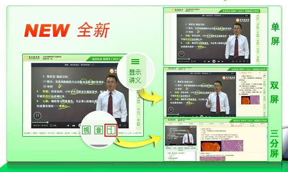 正保医学教育网是行业率先采用高清视频技术,实现宽屏高清课件授课。整套系统包括高清视频教学演示屏、全高清录制及后期制作设备,在教学设计、教学形式、画面呈现、学习体验等各个方面进行了升级。升级后的课程具有七大功能:仿真高清课堂,同步板书,讲座/讲义切换,单屏 / 双屏 / 三分屏模式,显示/隐藏老师,语速调节,Flash流媒体技术,使学员享有身临其境的学习感受。