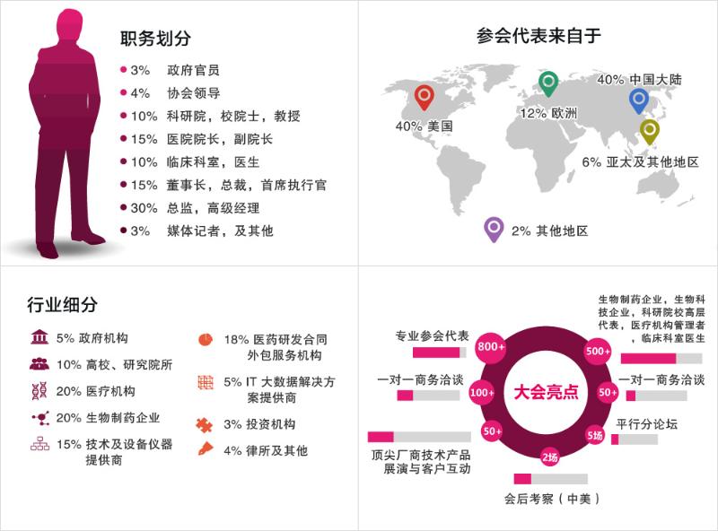 政策环境的利好、资本市场的青睐、医疗科技的创新为精准医疗产业的发展带来新契机。然而,精准医疗产业化出路在何方? 大数据如何与精准医疗结合?基因检测、精准诊断、靶向药物等细分领域的现状及挑战为何?医院如何进精准医疗建设?目前精准治疗的临床研发与应用现状如何?大会将邀请800+ 来自中美政府监管机构、行业协会、医院、科研院校、医药公司、生命科学及生物技术公司、CRO 企业、大数据解决方案提供商、投资机构、律所、咨询机构等高层代表共同探讨中美精准医疗面临的机遇与挑战,助推两国精准医疗产业发展。全球两大经济体的行业精英究竟能擦出怎样的火花?组委会热忱期待您的参与!
