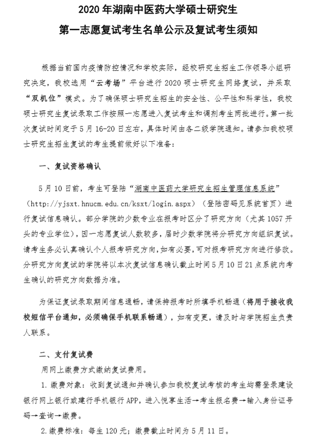 文件下载: 2020年湖南中医药大学硕士研究生第一志愿复试考生名单公示及复试考生须知