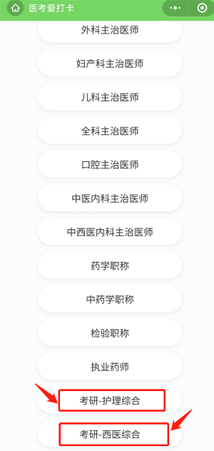 第二步:扫描之后会进入如下截图页面,选择您的备考科目,如考研-护理综合or考研-西医综合;