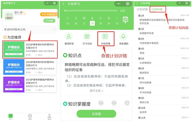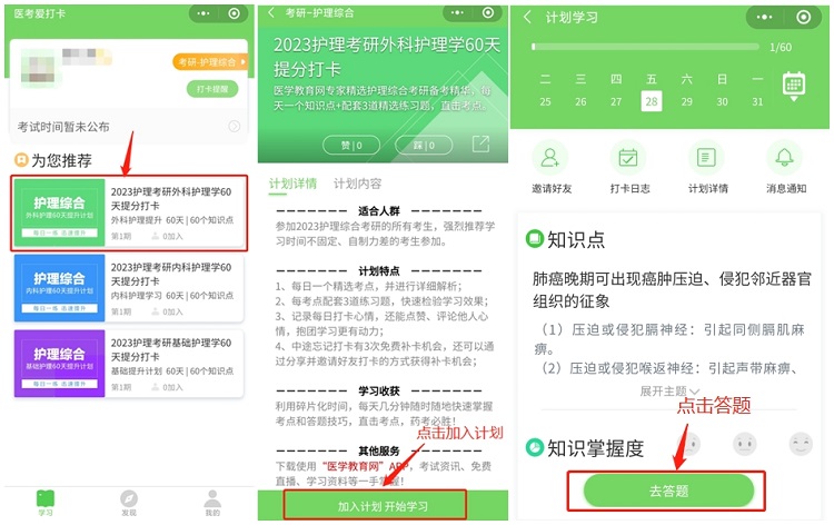 第三步:选择备考科目后即进入学习计划选择的页面,请选择“您的备考计划”,如2023护理考研外科护理学60天打卡计划,点击下方“加入计划 开始学习”按钮,开始正式进入打卡学习。