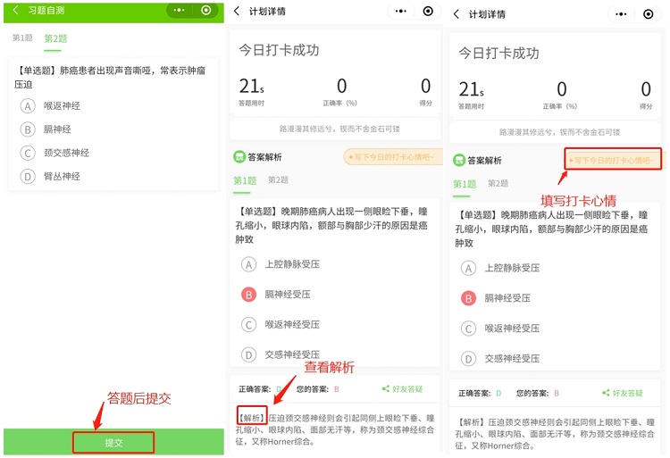 (3)查看测试结果+答案解析+分享今日打卡心情,提交完成打卡