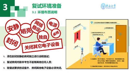 请考生认真阅读《东南大学研究生招生在线面试平台考生操作指南》,熟悉复试流程,并按要求做好面试准备。