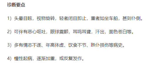 主症:眩晕,头重昏蒙,或伴视物旋转,胸闷恶心,呕吐痰涎,食少多寐,舌苔白腻,脉濡滑。