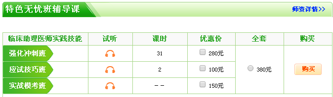 医学教育网2017临床助理医师实践技能特色无忧班辅导包含强化冲刺班、应试技巧班、实战模考班三大班次。针对每个考生的不同学习状况,进行有针对性地辅导。