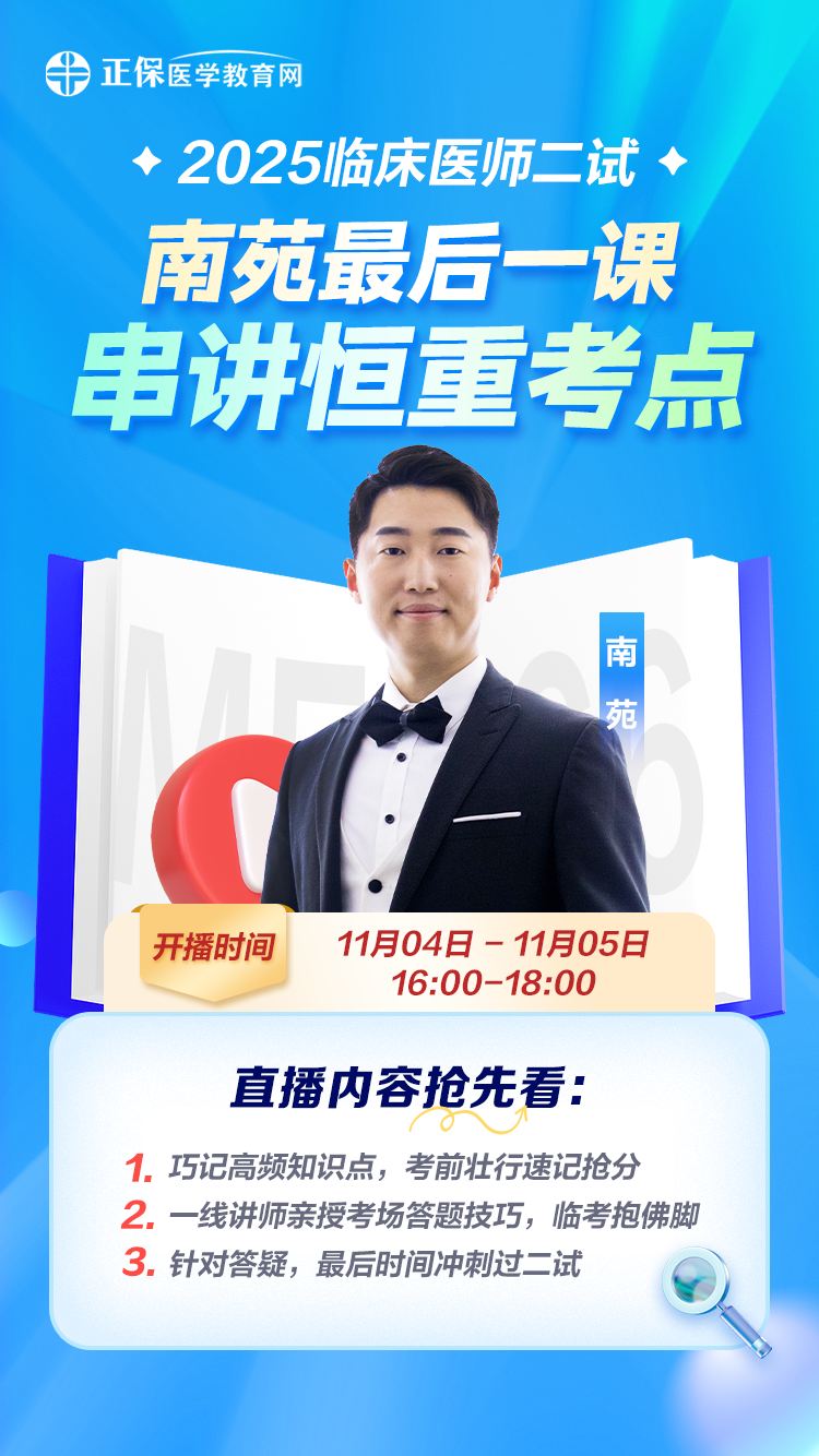 医学硕士,三甲主治,南苑老师有多年临床工作经验且深耕于医学教学一线多年,专注于医学教育及医师资格考试的研究、培训指导等工作,对考试大纲、题型以及考前培训有着深厚的理论基础和实践经验。从事医考培训工作至今,每年直接回应并精准解决学员各类问题逾三千条,以切实行动践行“从学员疑问中来,到学员心中去”的教学理念。深入挖掘每一位学员的困惑点,精准把握其知识盲区,确保每一次授课都能直击要害,不仅传授知识,更激发学员主动学习的热情与动力。在授课过程中,以实战经验为引导,创新教学方法为核心,致力于让复杂医学知识通俗易懂,帮助学员轻松掌握、深刻记忆并灵活运用。