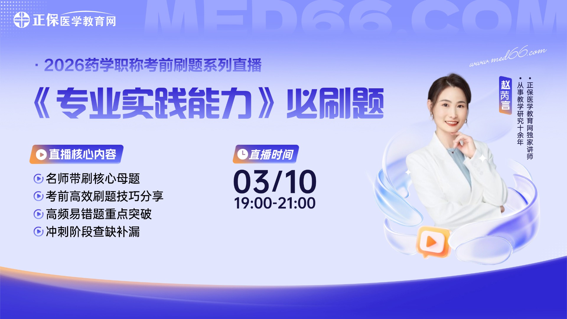 医学教育网专职讲师,从事教学研究十余年,对近十年的命题规律、考试方向、出题点均有深入研究。赵苪言老师以“简明扼要”作为授课理念,授课内容重点突出、总结性强,且有独特的记忆技巧帮助学员化繁为简,绝不做无用之功。