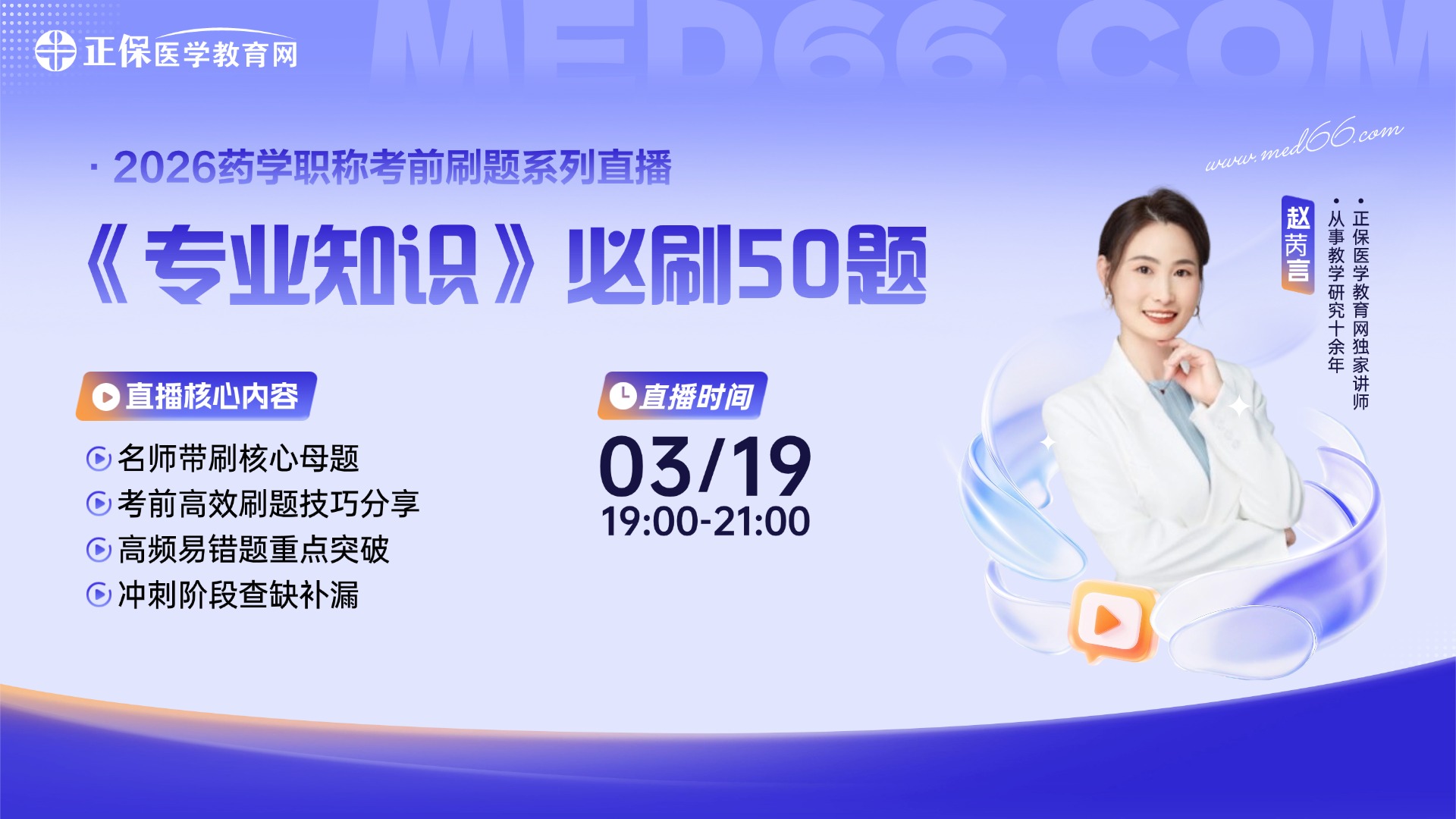 医学教育网专职讲师,从事教学研究十余年,对近十年的命题规律、考试方向、出题点均有深入研究。赵苪言老师以“简明扼要”作为授课理念,授课内容重点突出、总结性强,且有独特的记忆技巧帮助学员化繁为简,绝不做无用之功。
