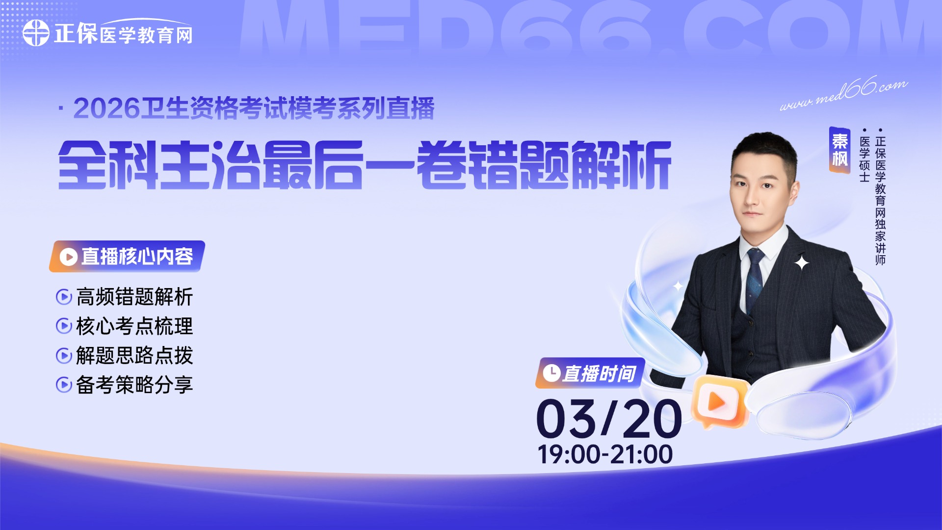 备考全科主治,错题反复困扰,复习方向难把握?秦枫老师直播精讲典型错题,梳理核心考点与解题逻辑。掌握高效复习思路,明晰备考重点,增强应试信心。3月20日19:00,点击预约,助力从容备考!