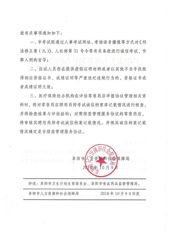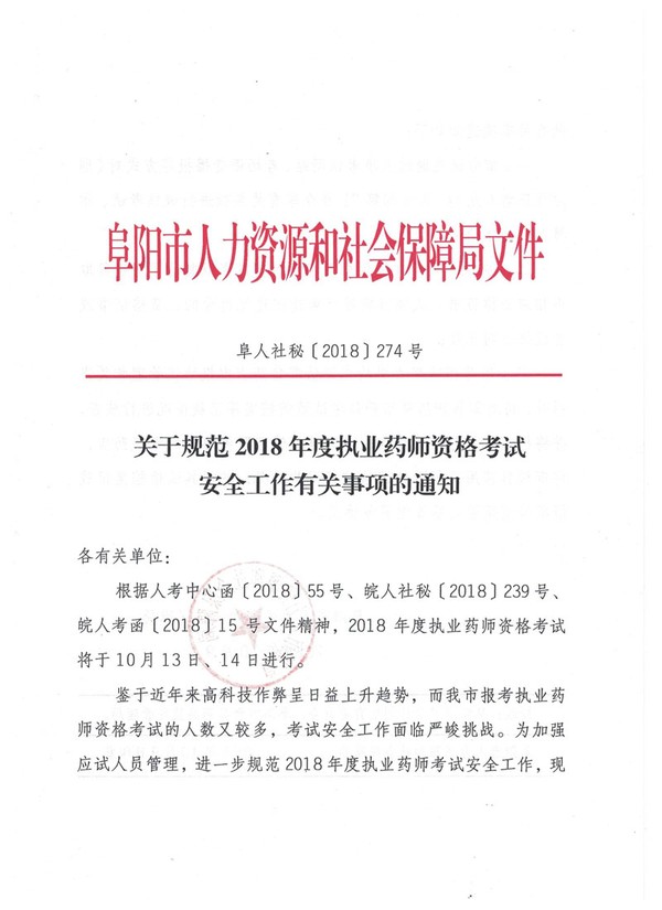 关于规范安徽省阜阳事2018年度执业药师资格考试安全工作有关事项的通知(阜人社秘﹝2018﹞274号)