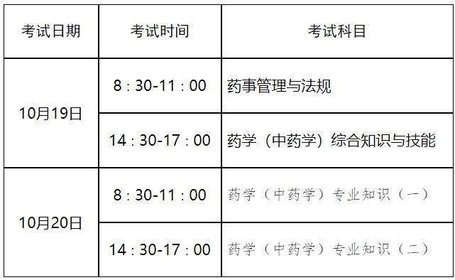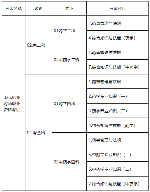 执业药师职业资格考试名称、级别、专业及考试科目信息设置如下: