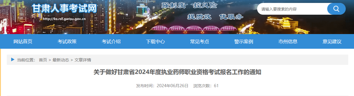 根据人力资源和社会保障部人事考试中心《关于2024年度执业药师职业资格考试考务工作的通知》(人考中心函〔2024〕29号)要求,2024年度执业药师职业资格考试(以下简称“执业药师考试”),将实行电子化考试(即机考)。现将做好我省执业药师职业资格考试报名工作有关事项通知如下: