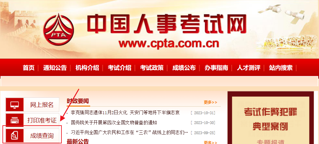 登录中国人事考试网——点击“成绩查询”——输入自己的用户名和密码。就可以查询自己的考试成绩了!